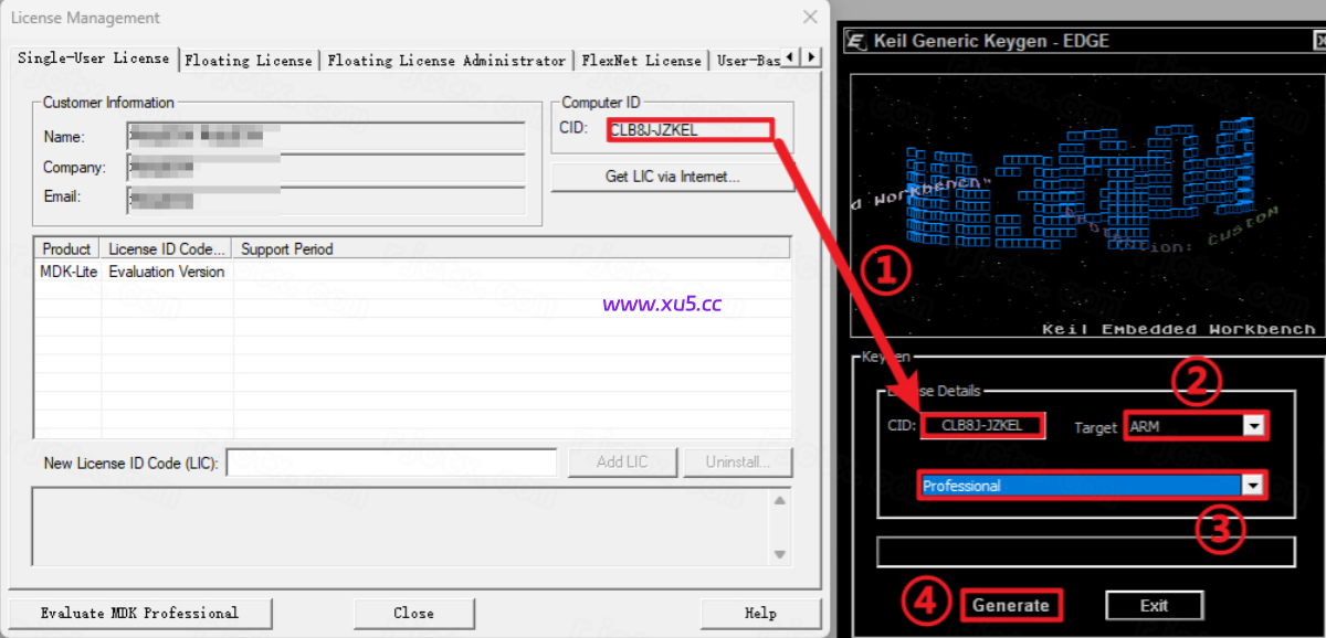 生成激活码:①使用快捷键“Ctrl+C”复制【CID】后的代码;使用快捷键“Ctrl+V”将代码粘贴到【CID】后的框中—-②点击【展开符】选择【ARM】—-③点击【展开符】选择【professional】—-④点击【Generate】生成激活码